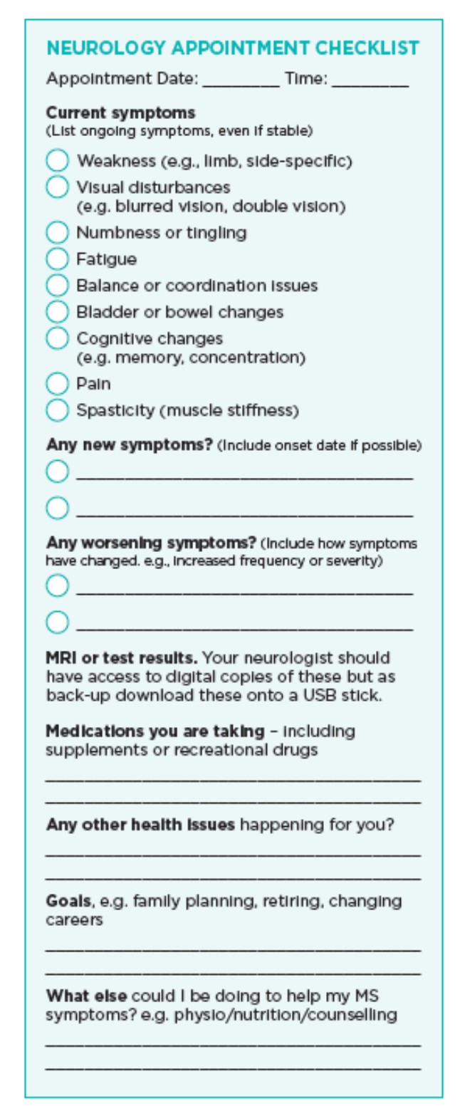 If you use this checklist to write down your concerns and questions between appointments, you can re-read it prior to your appointment and determine what to prioritise in your conversation with your neurologist. You can take it with you and make notes on it during the appointment, or your support person can make the notes for you.